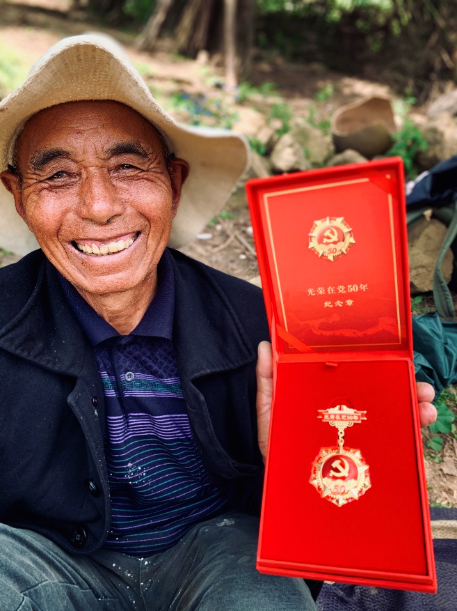 74岁的曲比阿日老爷爷,几十年如一日和乡亲们一起致力于退耕还林、植树种树,如今山坡上的树都已长成,树叶随风摩挲,阳光穿透密林洒落大地,一派岁月静好。博雅同学来访时,他正在树荫下清理采摘回来的草药,热情招呼同学们攀谈起来,给大家讲述彝族的神话故事,也讲述他亲身经历过的共产党领导人民进行民主改革、改革开放和脱贫攻坚的新彝族史诗。当同学们提出要合影纪念时,曲比爷爷特地回家隆重地换上彝族服饰,并自豪地向同学们展示“光荣在党五十年”的纪念章。阳光下纪念章闪耀夺目,显示着岁月长河中党员群众前赴后继一起为少数民族地区发展而不懈奋斗的光辉历史。