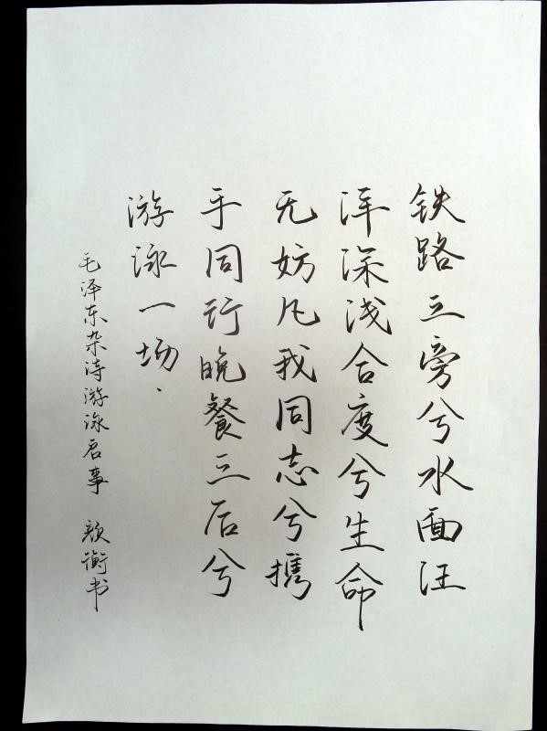 作品名称:毛泽东《游泳启事》。全文:铁路之旁兮,水面汪洋。深浅合度兮,生命无妨。凡我同志兮,携我同行。晚餐之后兮,游泳一场。