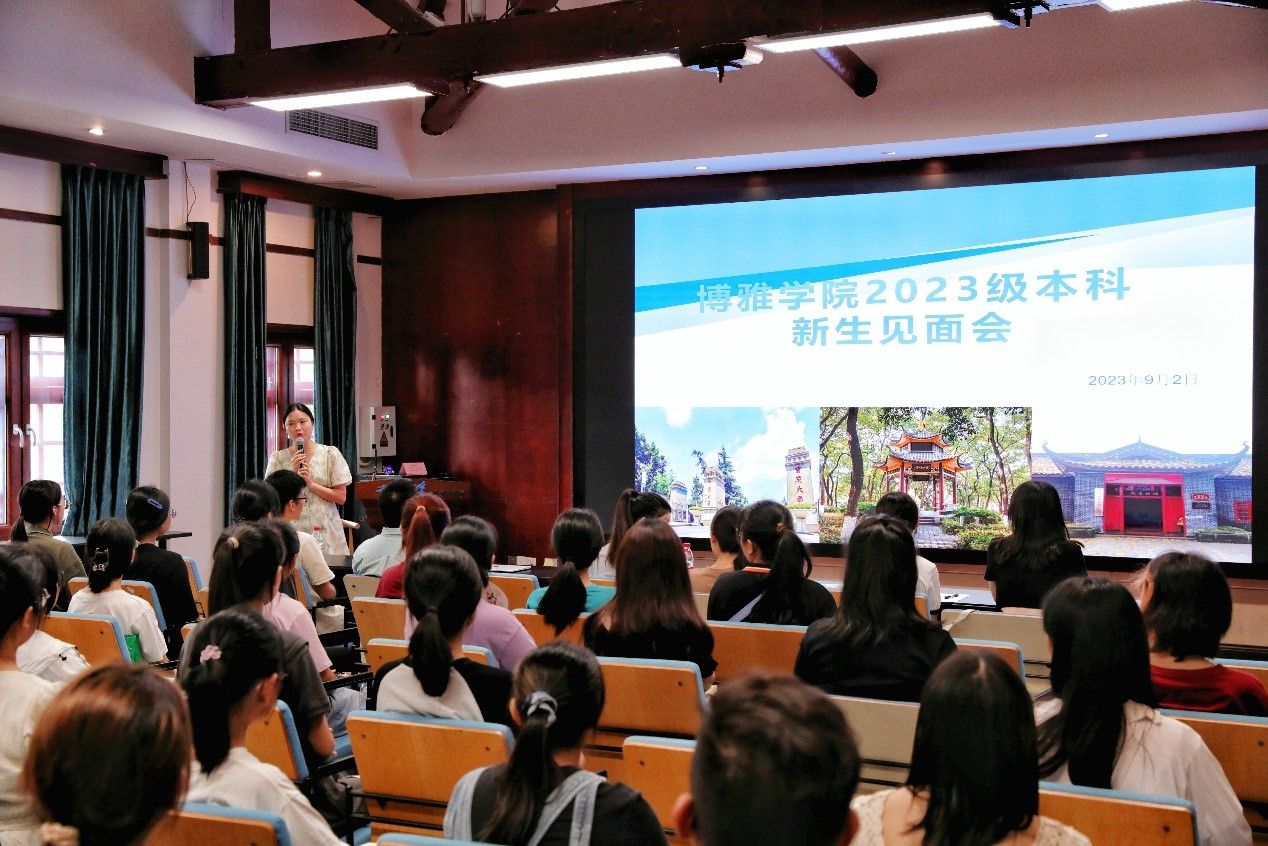 2023级本科新生见面会在博雅小院报告厅举行。本科生辅导员高宏佳、2023级班主任赵耀文、罗勇,高年级优秀学长学姐以及2023级全体同学参加了本次见面会。