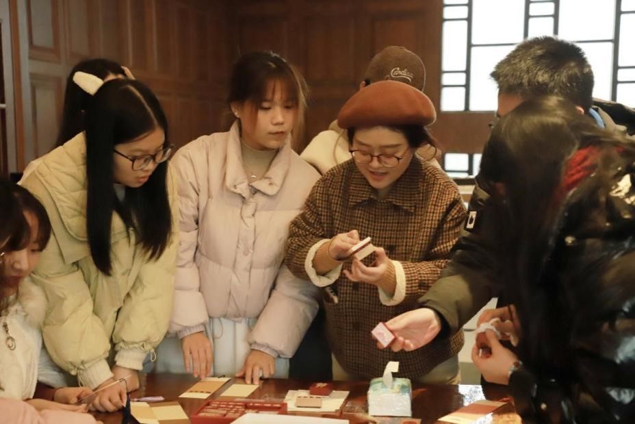图书馆特藏部,聆听特藏部主任王彦力老师、中文系万曼璐老师和袁敏老师的古法手工纸现场观摩教学。以目见、耳闻、手摸、鼻嗅的方式,沉浸式体验古纸之美、古典之韵。