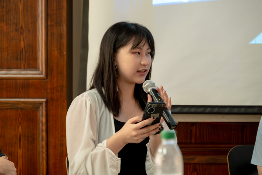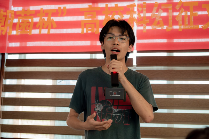 然后,是揭晓科幻微电影剧本赛道获奖情况的时间,第六届、第七届“朝菌杯”获奖者柏毅恒为剧本三等奖的获奖者们颁奖并宣读颁奖词,第十届“朝菌杯”高校科幻征文大赛组委会副秘书长张国威为剧本二等奖的获奖者们颁奖并宣读颁奖词,刘宇清老师为剧本一等奖的获奖者颁奖并宣读颁奖词。剧本一等奖得主,来自华东师范大学的邓文清亲自在现场分享了自己获奖的感受。