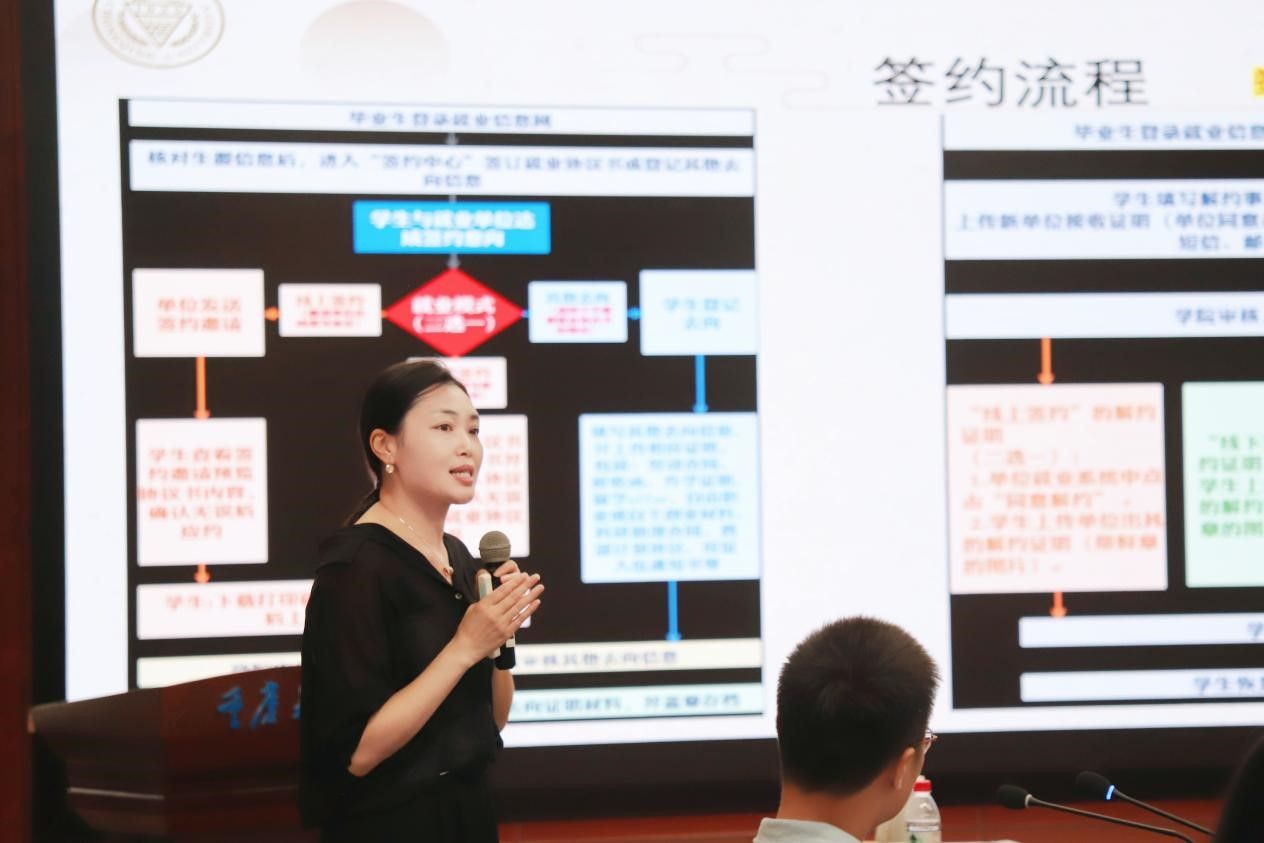最后,郑家勤老师为同学们详细讲解了就业协议书的签订流程和注意事项,提醒同学们要及时准备好就业所需的各类人事档案与材料;在签约过程中要关注诸多细节,避免因未经充分思考和评估而盲目签约或解约。