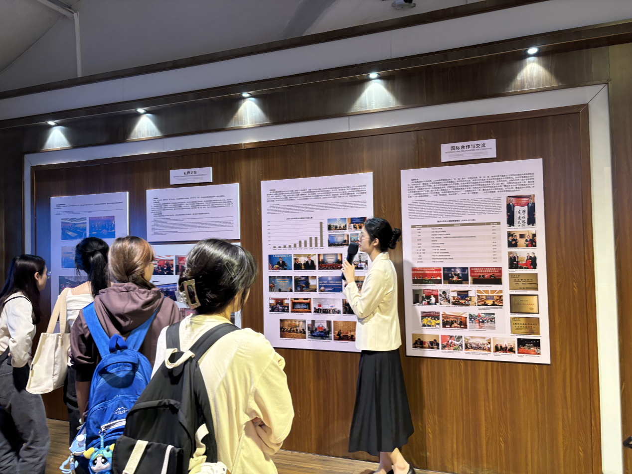 穿过学校标志性建筑的剪影走廊,在娓娓道来的讲解声中,同学们步入第三展厅“世纪华章,争先一流”,三校合一后的崭新面貌、历任党委书记和校长的辛勤付出、学院与学部的蓬勃发展、研究基地的丰硕成果,都化作学校一路走来的坚实足迹一一呈现在大家眼前。