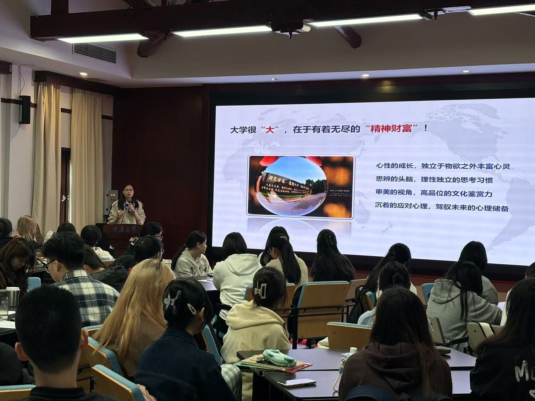 活动伊始,喻惠首先以“宏观大世界”为切入点,通过回顾国家取得一系列伟大成就的光辉历程,引导学生感受大时代的发展脉搏,恪守“立大志,明大德,成大才,担大任”的坚定信念;接着又回到每个人真实可感的“微观小世界”,为初来的同学们揭开大学生活的面纱,从大学之精神财富、学术大师、人才高台、时代新人等六个方面展开了介绍与交流。借助提问的契机,在场学生热情参与,主动发言,在思考与请教中逐步描摹理想的大学形象。