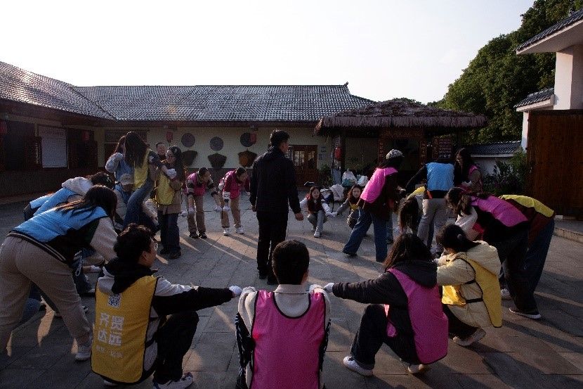 农耕体验后,同学们迎来了充满挑战的素质拓展活动。首先是拳王争霸赛,小组间通过猜拳接力,比拼速度,增强了团队凝聚力和合作精神。紧接着是齐眉棍游戏,要求同学们仅用一根手指协作将棍子举至眉毛高度,保持平行,锻炼了团队协作和沟通能力。最后是无敌风火轮游戏,全体同学共同拉紧登山绳,让两位同学在绳上行走,体验团结与信任的力量。