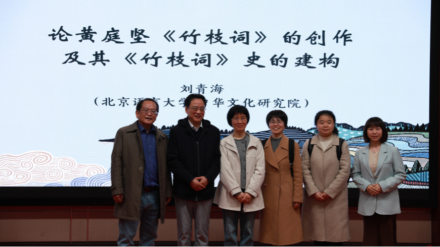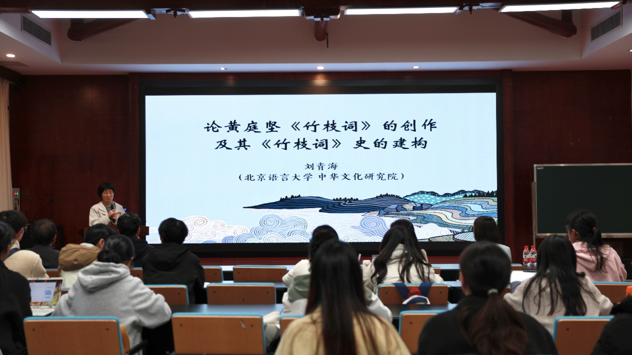 讲座伊始,刘青海教授介绍了《竹枝词》的起源与发展脉络。《竹枝词》原是巴渝一带的民间歌曲。唐代的《竹枝词》写作,具有从一种曲调衍生众多歌词的性质,因此词史家将其作为唐五代倚曲填词的一种。而黄庭坚以四组《竹枝词》独树一帜,既继承唐人传统,又突破其窠臼,将乐章体转为徒诗体,赋予《竹枝词》新的生命力。