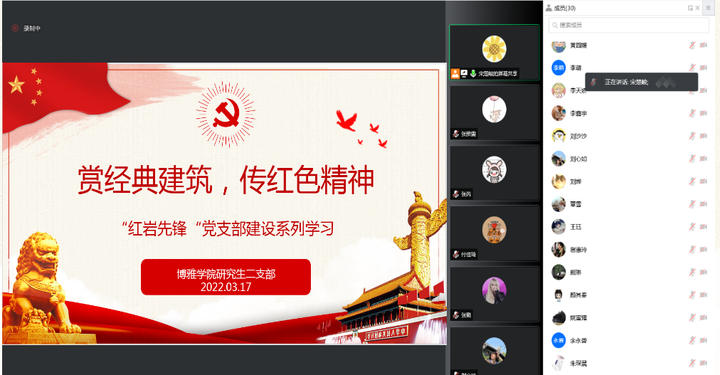 研究生二支部于2022年3月17日下午以线上会议的形式开展“红岩先锋”党支部建设系列之“赏校园红色建筑、传红色精神”支部活动。宋楚峻担任活动主讲人,支部35名党员参加本次党日活动。