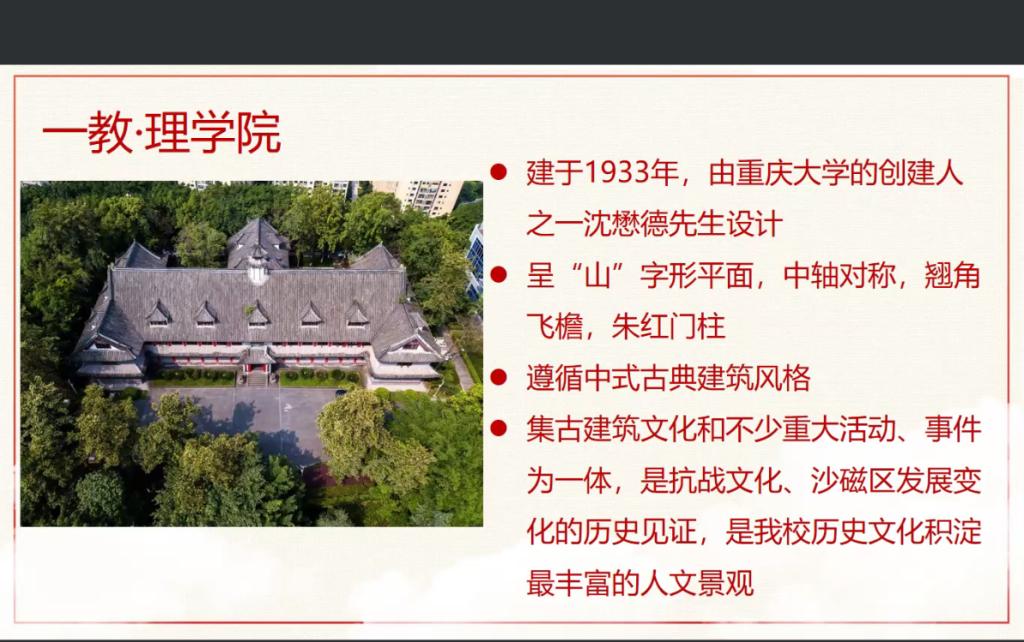 宋楚峻以时间为线,从建筑风格、建筑造型、相关历史人物与背景等方面展开校园红色建筑的讲述,文图并茂,深入细致地讲述从抗日战争时期到解放战争时期,校园红色建筑如一教理学院、二教工学院、文字斋、大轰炸纪念碑、寅初亭以及团结广场的历史由来。接着她从校园红色建筑资源延伸到历久弥新、代代相传的红岩精神,生动展现了御书屋