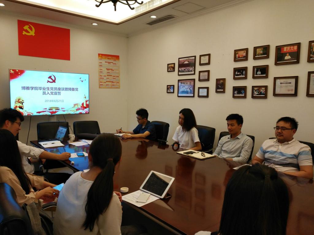 党委在文字斋小会议室组织毕业生党员召开座谈暨预备党员入党宣誓。会议由学院党务办公室主任薛育余主持,党委副书记胡佳同志与会并讲话。