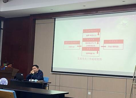在最后的“大学生入党流程理论与实务解析”主题学习中,杨聪林细致的为大家讲解了入党的流程,从提交入党申请书、入党积极分子的确立与培养,到发展对象的培训与预备党员的培养考察,最终预备党员转正成为正式的党员。他不仅讲解了发展党员的流程,还对严格入党流程的必要性做了讲解,强调要树立正确的入党动机,坚定入党的理想信念,不断加强对党的基本知识的学习。