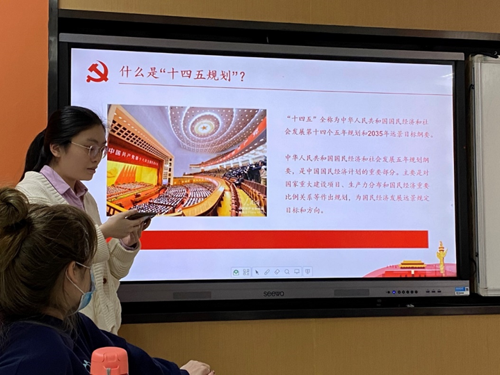 吴雨倩分享了十四五规划相关内容。她详细讲解了十四五规划的编制过程(包括编制启动、重要指示、意见征求、会议审议等内容)和主要内容,使同学们对十四五规划有了更加细致、全面的了解。她提到在未来的十五年里,作为共青团员在向党组织靠拢的同时,也要不忘初心,砥砺前行,为实现自己的人生理想,实现中华民族伟大复兴的中国梦而不懈奋斗。