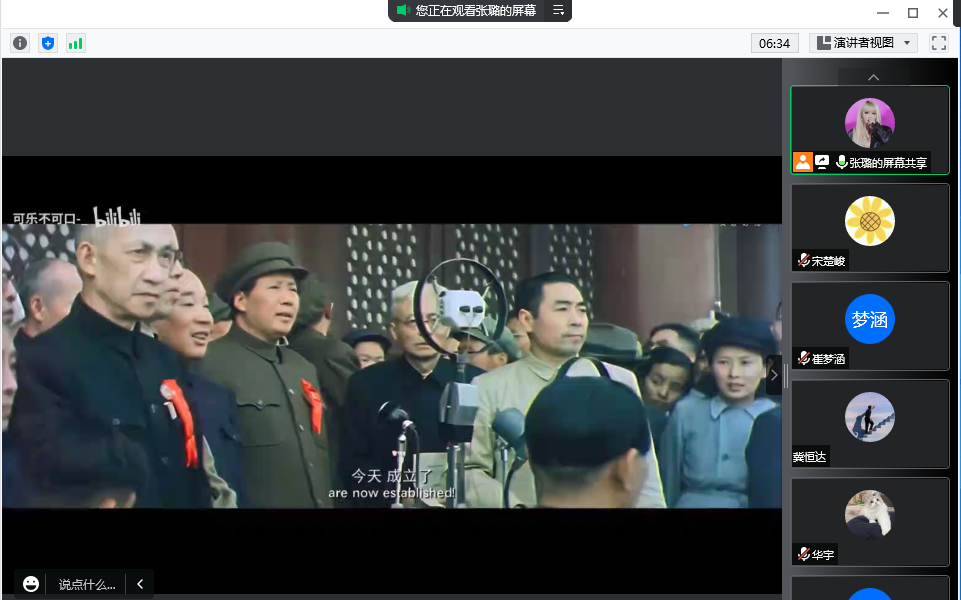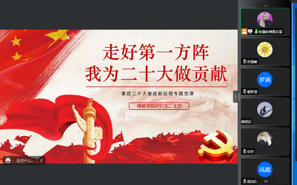 二支部的纪检委员张璐主持,支部党员和积极分子一同参加。活动伊始,张璐通过视频引入,为我们梳理了中国共产党成立以来各个阶段的历史重大事件,展现了中国共产党一路走来的峥嵘岁月。