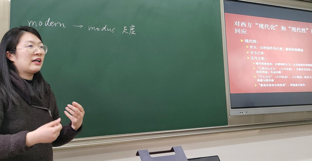 支部书记肖馨瑶首先讲解了党的二十大报告关于“中国式现代化”的相关论述。随后,她围绕中国式现代化的五个含义进行充分讲解。她谈到,中国式现代化的五个内涵分别可以看作对西方现代化与现代性带来的若干问题和困境的反思和回应,即以中国道路作为解决之道。