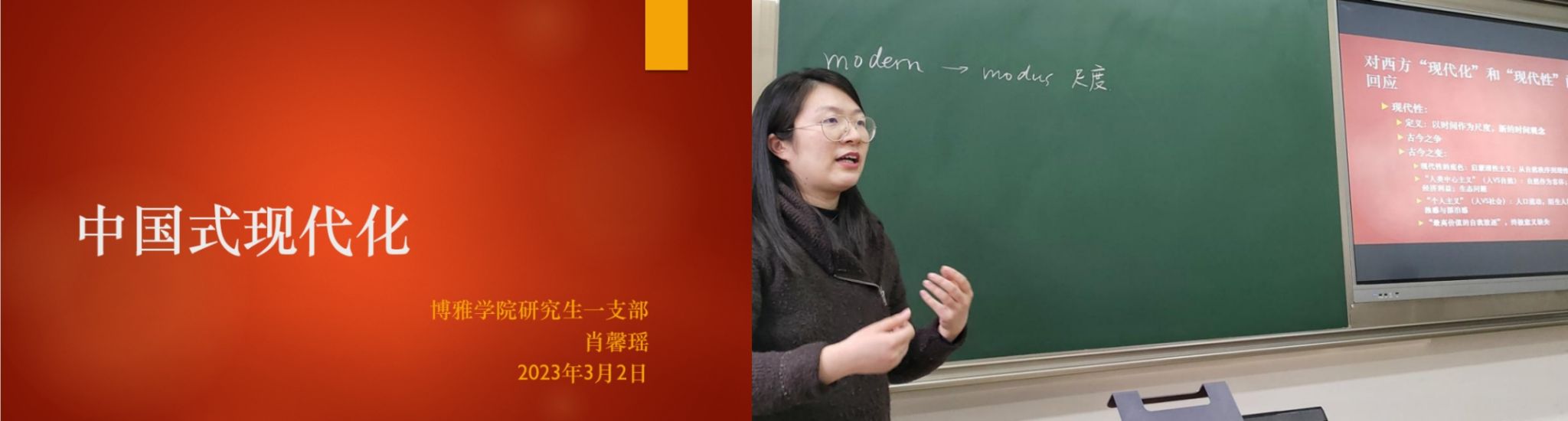 2023年是全面贯彻落实党的二十大精神的开局之年,为使支部同志更好地理解中国式现代化,全面学习、把握、落实党的二十大精神, 3月2日,支部书记肖馨瑶以“中国式现代化”为题,为支部全体党员和入党积极分子上了一次生动的党课。首先,肖馨瑶讲解了党的二十大报告关于“中国式现代化”的相关论述。随后,她围绕中国式现代化的五个内涵进行了细致分析,并指出中国式现代化的五个内涵可看作是对西方现代化与现代性带来的若干问题和困境的反思和回应,进而对中国式现代化的五个维度进行了总结。她谈到,“中国式现代化是人口规模巨大的现代化”突出的是中国的治理方式,中国式现代化中有关共同富裕、和平发展的内涵则从经济发展方式和国际关系层面回应了西方现代化的问题,而对于人与自然和谐共生、物质文明和精神文明相协调的强调最终从哲学与思想层面回应了西方现代性带来的困境与危机。