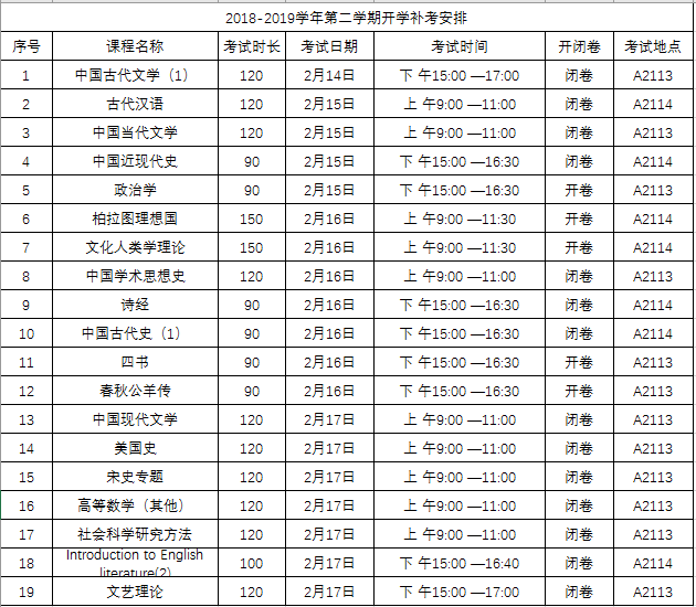御书屋 2018-2019学年第二学期开学补考安排如下: