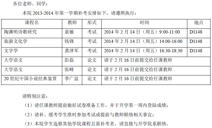 高研院2013-2014年第一学期补考安排