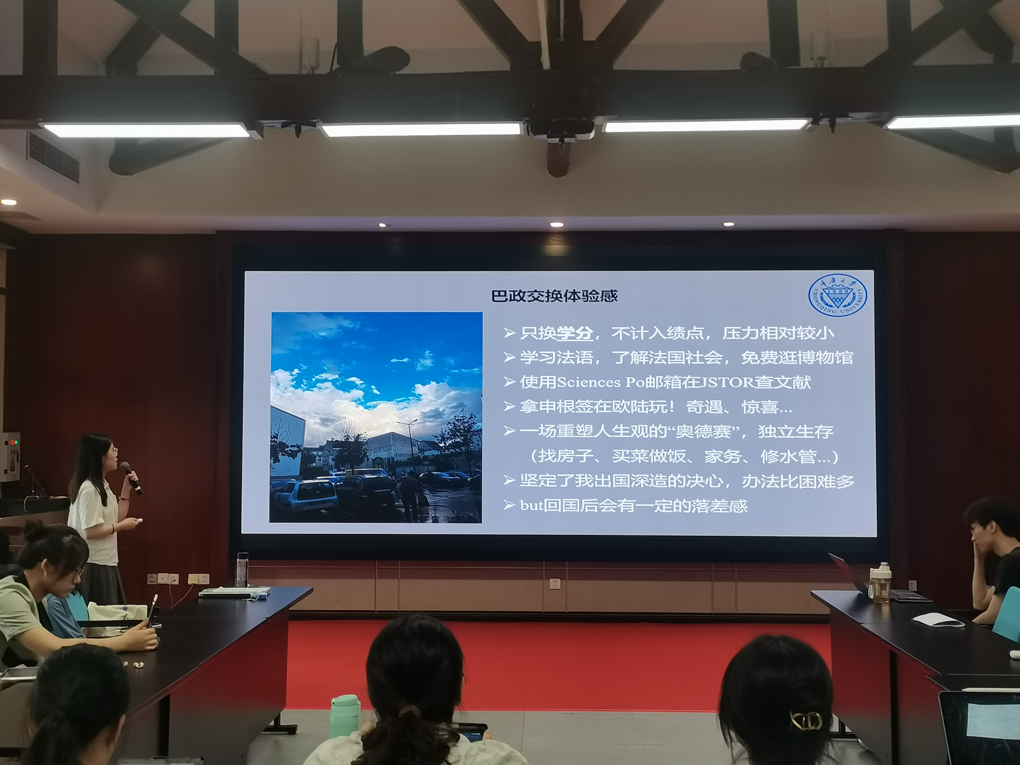 在分享环节中,两位刚刚从海外交流学习归来的学生代表分享了他们的宝贵经验。首先,中文系研究生高凤璐同学分享了自己2023年秋季学期在台湾大学的交换学习经历。在信息获取渠道方面,高凤璐建议同学们主动关注御书屋