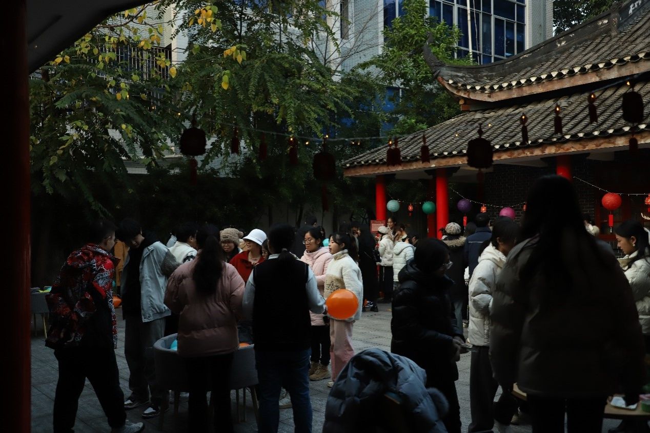 节目表演结束后,游戏环节在小院内有序展开。室内室外共设置《飞花令》、《猜灯谜》、《投壶》等10个既有趣又富含文化底蕴的游戏。同学们积极参与到各个游戏当中,小院充满了热闹而快活的氛围。赏玩之余,学院还为大家准备了精美的糕点、水果和饮料等吃食,灯笼和窗花的装饰相得益彰,整个小院笼罩在浓浓的迎新氛围之中。活动结束后,师生们根据积分在兑奖处换取心仪的奖品。夜幕缓缓降临,本次迎新游园活动也完美落幕。