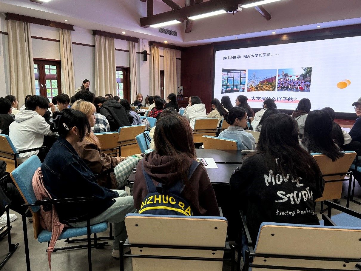 活动伊始,喻惠首先以“宏观大世界”为切入点,通过回顾国家取得一系列伟大成就的光辉历程,引导学生感受大时代的发展脉搏,恪守“立大志,明大德,成大才,担大任”的坚定信念;接着又回到每个人真实可感的“微观小世界”,为初来的同学们揭开大学生活的面纱,从大学之精神财富、学术大师、人才高台、时代新人等六个方面展开了介绍与交流。借助提问的契机,在场学生热情参与,主动发言,在思考与请教中逐步描摹理想的大学形象。
