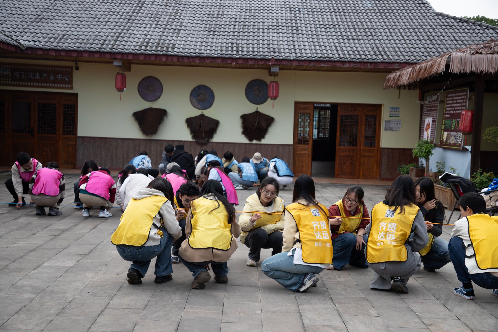 农耕体验后,同学们迎来了充满挑战的素质拓展活动。首先是拳王争霸赛,小组间通过猜拳接力,比拼速度,增强了团队凝聚力和合作精神。紧接着是齐眉棍游戏,要求同学们仅用一根手指协作将棍子举至眉毛高度,保持平行,锻炼了团队协作和沟通能力。最后是无敌风火轮游戏,全体同学共同拉紧登山绳,让两位同学在绳上行走,体验团结与信任的力量。
