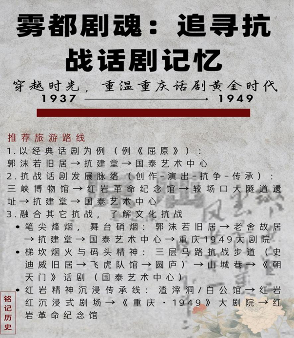 同时,团队设计了话剧文化主题旅游方案。方案整合重庆抗战话剧遗址,串联起郭沫若旧居、抗建堂、国泰艺术中心等节点,打造文旅融合的特色路线。为增强体验感,团队还构思了系列创意项目解决方案:在防空洞利用投影或VR技术重现当年戏剧演出场景,搭建微型表演模型同步播放经典剧目的音频;开发沉浸式剧本光影剧场套装、声纹明信片等文创产品,让游客在互动中深度感受抗战话剧的历史温度。