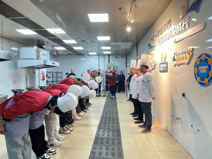 活动特别邀请食堂资深厨师长担任实践导师。在完成安全须知宣讲后,现场举行了庄重的拜师仪式——10名同学整齐列队,面向厨师长深鞠三躬,以传统礼仪传递求学诚意;厨师长微笑颔首回应,正式接纳同学们为“徒弟”,现场氛围庄重而温馨。