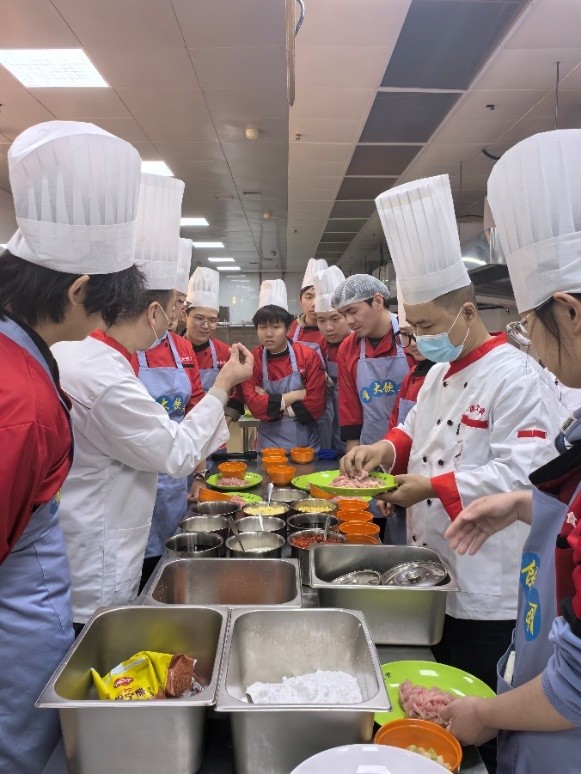 拜师仪式后,“后厨第一课”随即开讲,导师围绕灶具安全操作、刀具使用规范、食材选购储存、调味比例把控等内容,系统讲解中式烹饪基础要点。同学们围站操作台旁,紧盯师傅的示范动作,认真记录关键步骤。这场理论讲解不仅传授了烹饪技能,更传递了“食材有价、劳动无价”的理念。