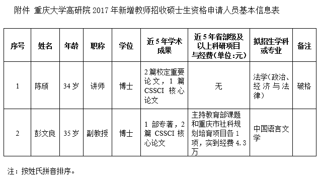 教师招收硕士生资格审核办法》(重大校〔2015〕228号)的要求,经院学位评定分委员会组织评审,拟推荐如下申请教师获得2017年招收硕士生资格,并报学校研究生院审核: