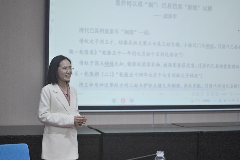 在报告环节,龚泽军老师就巴县档案里的“娴媳”从语文学视角予以阐释:首先,从字形上看,“娴媳”之“娴”,当是“闲”;语音上,巴县档案里的“闲”,有“xian”“han”两读;字义上,“闲媳”之“闲”,是“闲房”的缩略。其次,基于《汉语方言大词典》《伦理与生活——清代的婚姻关系》,龚泽军老师梳理了汉语方言里童养媳的称谓及其特点。再次,“闲房媳妇”的“闲房”,是与“团房”“圆房”相对而言的,为未圆房之义。西南官话里的“寒胖子媳妇儿”等形式,是由“闲房媳妇”演变而来的。最后,龚泽军指出,钩沉巴县档案里的“娴媳”的用法可以启发我们重视地方档案里的方音与方俗词语。