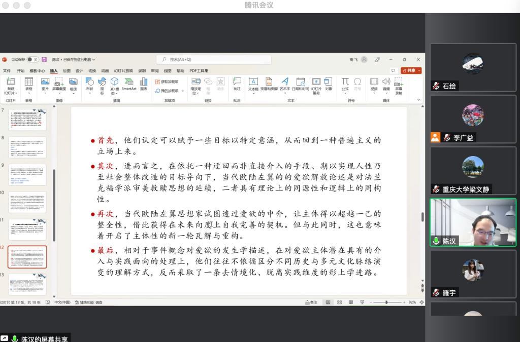中文系学术沙龙在线上顺利举行,秋季学期“博士论文奖学金”访问学者、武汉大学文学院博士候选人陈汉做了题为《主题重构的尝试及其限度——论当代欧陆左翼哲学对爱欲概念的重塑》的学术报告,中文系全体教师参加了本次活动。