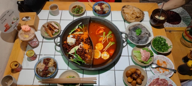 说到这里,想必各位脑海中已闪过无数“赛博朋克”科幻中“危机四伏”的大都会场景。别怕,重庆市不是“哥谭市”。重庆人民拥有对冲“赛博朋克”颓废与离散气质的“法宝”:火锅。重庆火锅,专业治疗各种精神内耗。火锅局一开,天地万物、阴阳运转均汇于一锅之中。辣味、热气与喧嚣能在一瞬间冲破“可悲的厚障壁”,让陌生人迅速相熟、相知、相互成为微信好友,并在两个小时后携手漫步雨中。重庆人民常说:“没有什么是一顿火锅解决不了的,如果有,那就吃两顿。”在重庆,火锅局是共同体最浪漫的表现形式。我的一位浙江朋友今年被“辣哭”后还带了一箱火锅底料回去便是明证。