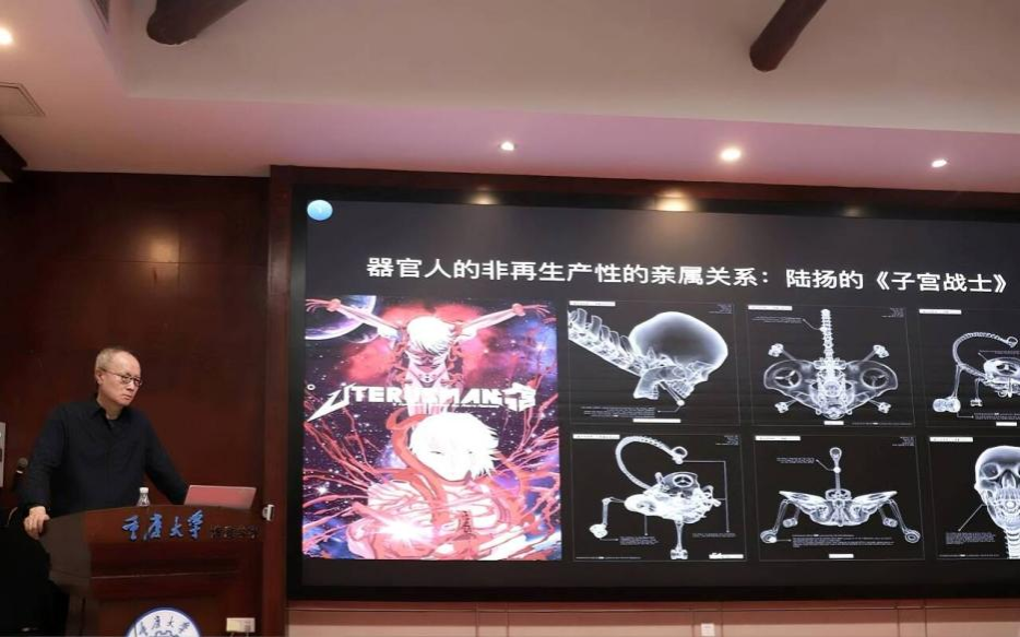 接着,任教授通过陆扬的另一件艺术作品——《震颤麻痹计划》(Krafttremor – Parkinson’s Disease Orchestra)——对大脑作为环境这一概念进行了说明。该作品将帕金森病视为环境问题,患者被迫日复一日进行重复性活动,大脑的反应和活动,以及连带的身体活动和社会活动,却并不是循环衰退的,反而仍具有生成创造的能力,这说明,大脑不仅是生物性的神经中心,也是控制论和机械系统的对应物,更是栖居在地球这一宏大生态体系中的一部分。在陆扬的作品《子宫战士》中,这一思考得到了进一步扩展,“子宫战士”在其宇宙世界中展现的是利用DNA技术将人类器官形态改变,令身体不同器官、激素都能成为主体主动使用的工具。该作品一方面揭示了一种“身体的技术”如何能够超越梅洛·庞蒂以来关于“身体-主体”的思考,另一方面也借由这种非生产性的亲属关系来反思传统的亲属关系,凸显了通过与技术缔结亲缘进而与充满麻烦的世界共存的可能性。