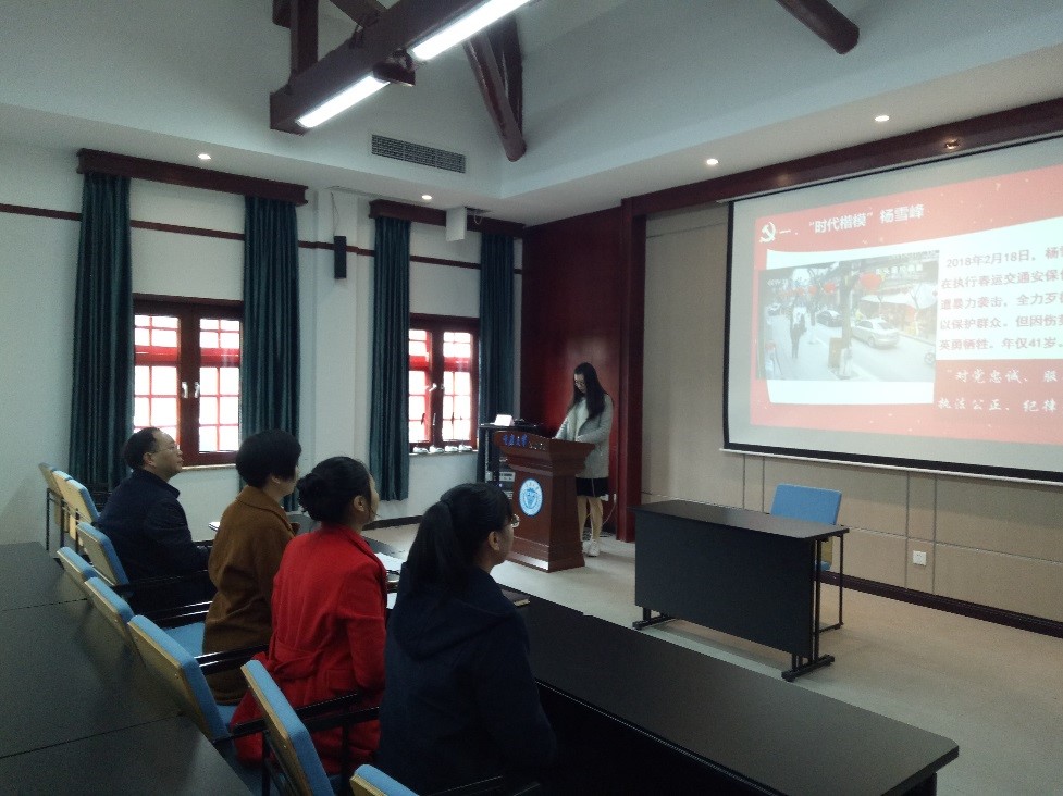 首先,发展对象陈靖作了“向时代楷模杨雪峰同志学习”专题报告。该报告详细介绍了杨雪峰同志的英勇事迹,并分别从政治品质、人民情怀、价值追求和道德操守四个方面带领大家向杨雪峰同志学习。支部党员和发展对象皆被杨雪峰同志奉献基层、爱岗敬业、牢记使命的高尚品格和崇高精神所感动。