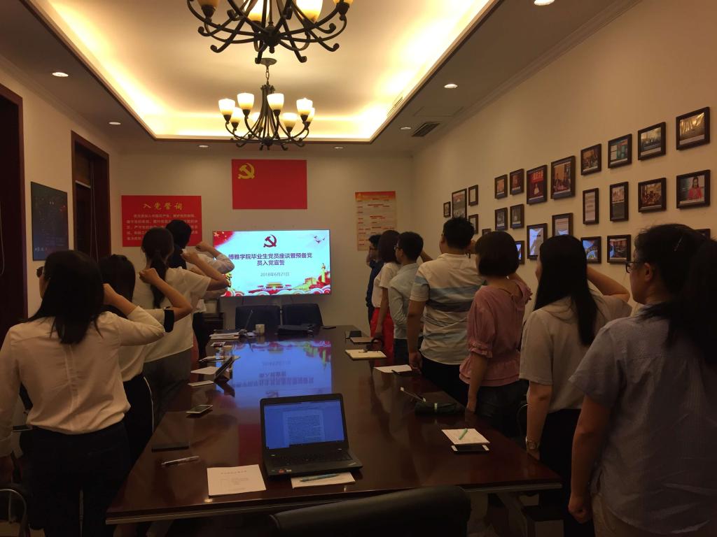 党委在文字斋小会议室组织毕业生党员召开座谈暨预备党员入党宣誓。会议由学院党务办公室主任薛育余主持,党委副书记胡佳同志与会并讲话。