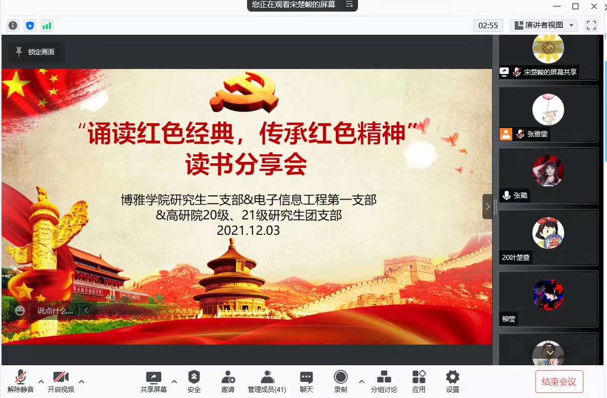 2020级、2021级硕士研究生团支部,于2021年12月3日下午,以“腾讯会议”为平台,开展“诵读红色经典,传承红色精神”的线上主题党日活动。本次活动由御书屋