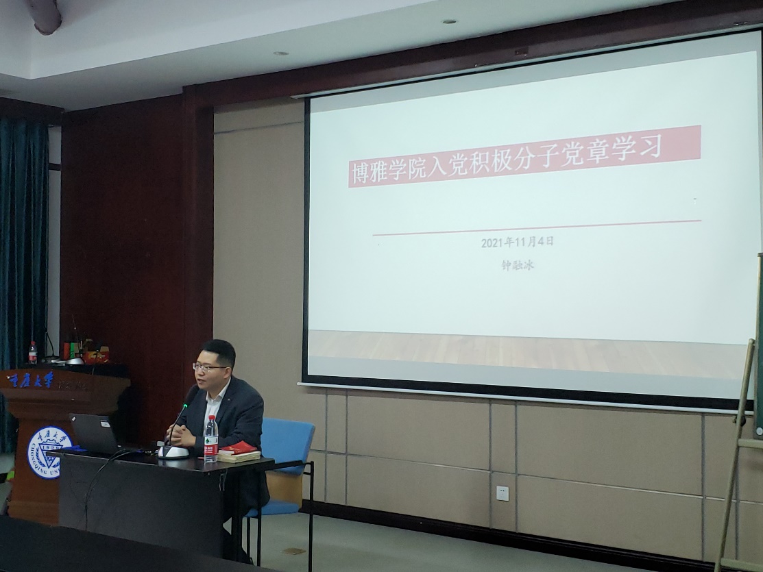 在“学党章”主题学习中,钟融冰带领大家一起学习了党章,强调了学习党章重要性。他结合党章,重点向入党积极分子们讲解了党员的权利与义务,对大家提出“要加强党性修养、坚定理想信念”的要求。他还提到“加入党组织是光荣的,但也代表着更多的责任与担当,吃苦在前,享受在后,不管何时都要牢记党的宗旨‘全心全意为人民服务’”。