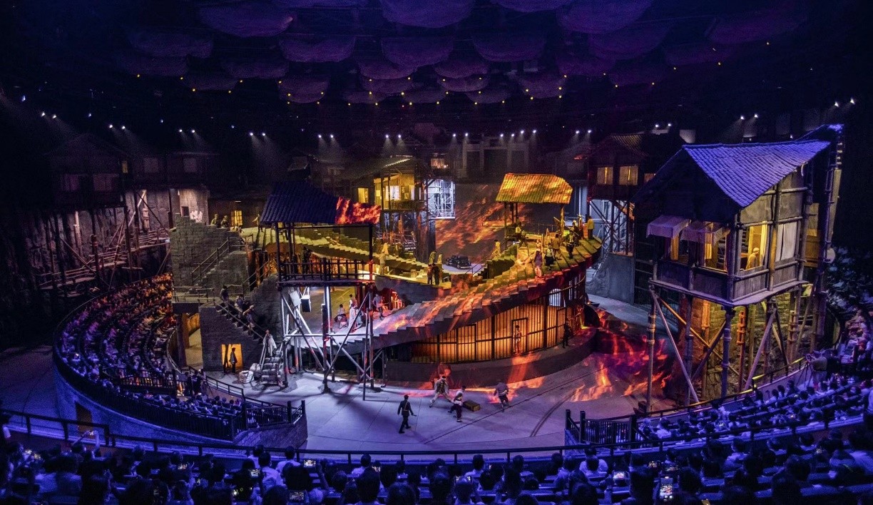 舞台剧《重庆·1949》以1949年重庆解放前夕的历史为背景,几条主线并行交织,讲述了众多被关押在渣滓洞、白公馆的中国共产党人在黎明即将到来的前夜,与敌人殊死搏斗、宁死不屈的感人故事,歌颂了先烈们矢志不渝的革命情怀、不畏牺牲的崇高品质和不折不挠的浩然正气。吊脚楼建筑群、石阶与牌坊、巨轮扬帆等构成一幅幅真实生动的场景,党员同志们仿佛回到了黎明前的山城,沉浸式领略了那一段满含悲壮而又令人肃然起敬的历史。
